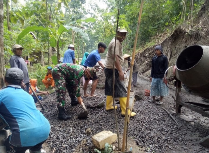 Boyolali - Sebagai seorang aparat kewilayahan, Babinsa selalu hadir dan membantu setiap kegiatan yang ada di wilayah binaan, seperti dilakukan oleh Babinsa Koramil 13/Nogosari Kodim 0724/Boyolali Serma Mujiarto yang ikut bergotong royong memperbaiki jalan di Dukuh Bakalan Desa Kenteng Kecamatan Nogosari Kabupaten Boyolali.