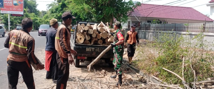 Surakarta - Babinsa Kelurahan Serengan Koramil 03 Serengan Kodim 0735 Surakarta Serda Ichsan Agung bersama Dinas Pekerjaan Umum ( DPU) Kota Surakarta   melaksanakan pemangkasan ranting-ranting pohon yang mengganggu pengguna jalan dan penebangan pohon yang diperkirakan rawan tumbang. Pelaksanaan kegiatan ini dilakukan di Jalan Utama wilayah Kelurahan Serengan Kecamatan Serengan Kota Surakarta, Minggu (19/11/2023).