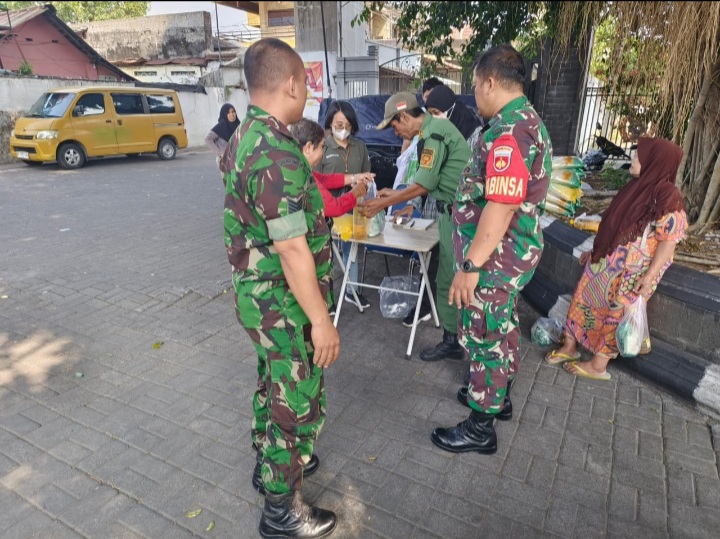 Surakarta - Babinsa Kelurahan Kemlayan Koramil 03 Serengan Kodim 0735 Surakarta Serda Catur Handoko & Bati Wanwil Serma Mugiyanto melaksanakan pendampingan kepada Bulog Kota Surakarta dalam Penjualan sembako murah di peruntukan warga Kemlayan di jalan Langen Asmoro RT 04 RW 06 Serengan Kota Surakarta, Jum'at pukul 09.00 WIB (24/11/2023)