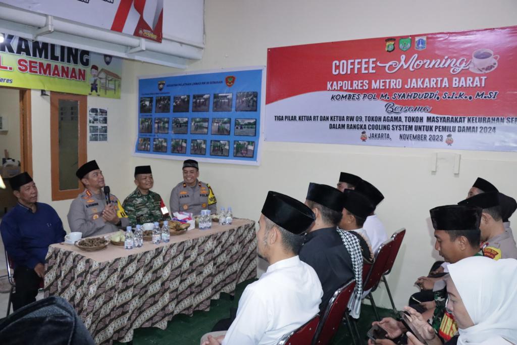 Jakarta Barat - Dalam atmosfer hangat Coffee Morning, Kapolres Metro Jakarta Barat, Kombes Pol M. Syahduddi, didampingi oleh Kapolsek Kalideres Kompol Abdul Jana, pejabat utama Polres Metro Jakarta Barat, 3 Pilar Kecamatan Kalideres, dan Toga serta Tomas Kelurahan Semanan, memberikan dukungan positif kepada petugas Linmas dan Pos Satkamling.