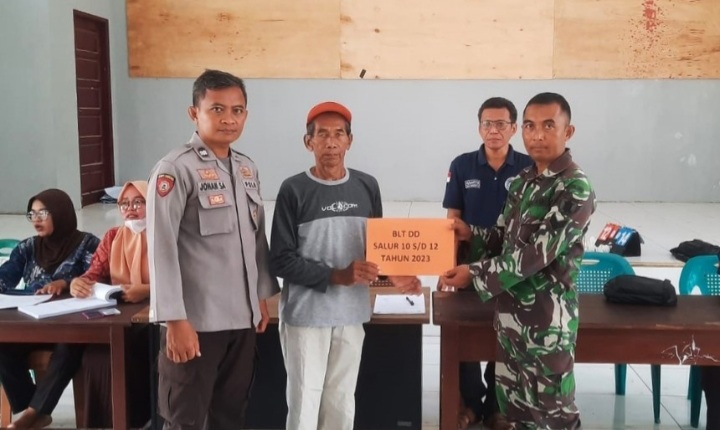 Kutai Kartanegara - Program pemerintah desa dalam upaya meningkatkan kesejahteraan masyarakat miskin Babinsa Koramil 0906-09/Kota Bangun Kodim 0906/Kutai Kartanegara, Serka Yuwono bersama Bhabinkamtibmas melakukan pendampingan dalam penyaluran Bantuan Langsung Tunai Dana Desa (BLT-DD) yang diadakan di BPU Kantor Desa Kotq Bangun (Koba) 3 jalan Poros Melak Samarinda Kecamatan Kota Bangun Darat, Sabtu (2/12/2023).