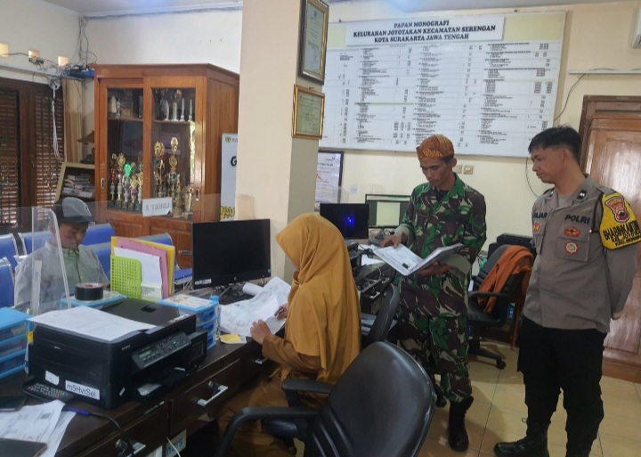 Surakarta - Babinsa Kelurahan Joyontakan Koramil 03 Serengan Kodim 0735 Surakarta Sertu Hernawa dan Koptu Rudy bersama Bhabinkamtibmas Aipda Fajar  melaksanakan kegiatan rutin, yang merupakan salah satu bagian tugas pokoknya yaitu melaksanakan interaksi secara langsung dengan Sekertaris Kelurahan dan Perangkat lainnya, pukul 09.00 WIB, Senin (4/12/2023).