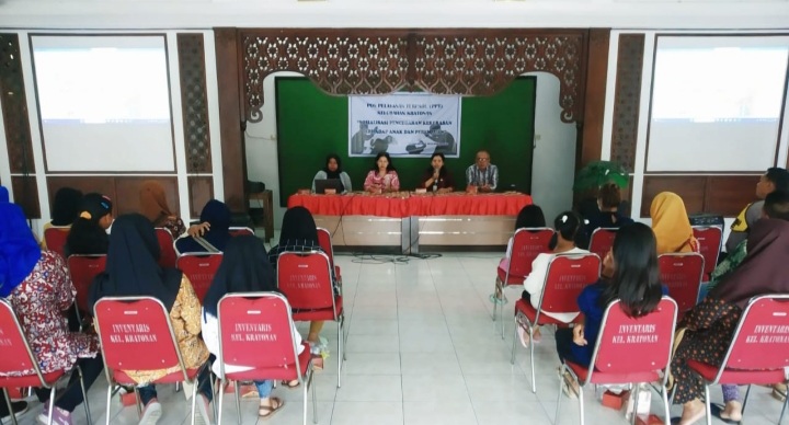 Acara dibuka oleh Kepala Kelurahan Kratonan Ibu Pertiwi SE. M.Si, Peserta kegiatan tersebut terdiri dari Bhabinkamtibmas, PKK, Kepala PPT, Ketua LPMK dan perwakilan masyarakat. Materi disampaikan oleh Sdri Intan Hadiah Rastiti. SH dari yayasan kakak. Tujuan dari sosialisasi ini adalah mengedukasi dan memberikan informasi kepada masyarakat tentang pencegahan dan penanganan kasus kekerasan terhadap perempuan dan anak.