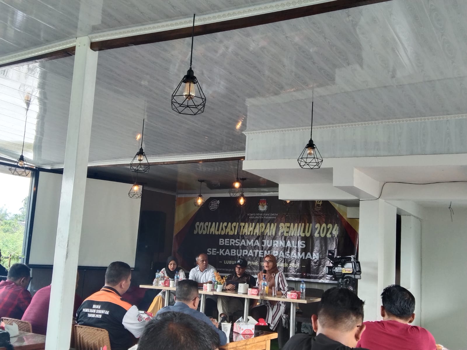 Pasaman - Guna memberikan informasi yang akurat dan terpercaya terkait penyelenggaraan tahapan pemilu tahun 2024 , KPU Pasaman gelar sosialisasi tahapan Pemilu bersama jurnalis se Pasaman di Aula Ambun Water Park Cafe, Minggu (10/12/2023).