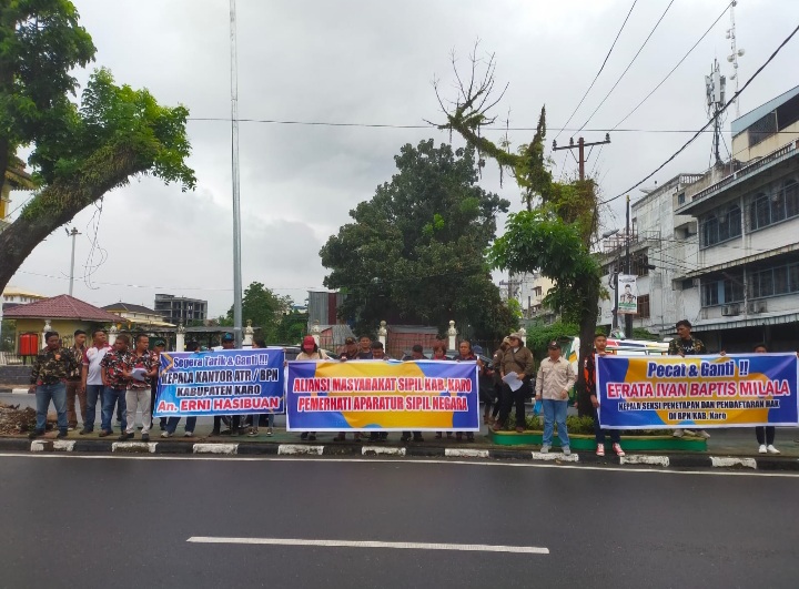 Dalam aksi ini puluhan mayarakat dari beberapa ormas dan okp dan pengurus LSM kab.karo , menuntut kepada kepala kepala kanwil BPN Sumut sebagai perwakilan kementrian ATR/BPN RI bisa menindak tegas untuk mencopol jabatan kepala BPN Kabupaten Karo Erni Hasibuan dan Eferata Ivan Baptis Milalal, Kasi penetapan dan pendaftaran hak BPN Kabupaten Karo.