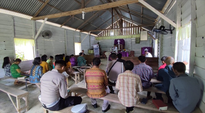 Inhil - Polsek Kemuning Polres Indragiri Hilir (Inhil) melaksanakan Kegiatan Rutin Minggu Kasih di gereja HKBP Dusun Massad Desa Keritang Kecamatan Kemuning, kali ini giat dilaksanakan oleh Kanit Provost IPDA J. SIAGIAN bersama Bripda WILLIAM, pada hari Minggu (24/12/2023).