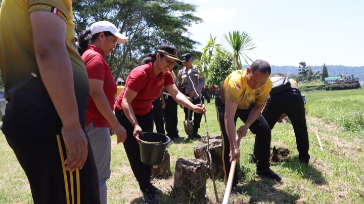 Buleleng - Kegiatan Penanaman pohon dalam rangka Polri peduli Lingkungan mengambil lokasi di areal pinggiran danau buyan Desa Pancasari, Sukasada yang dikomandoi oleh Kapolres Buleleng AKBP Ida Bagus Widwan Sutadi, S.I.K.,M.H beserta PJU Polres Buleleng, Kapolsek Sukasada, anggota polres Buleleng, perbekel pancasari ibu ibu PKK dan warga masyarakat Desa Pancasari, Sabtu, (23/12/2023).