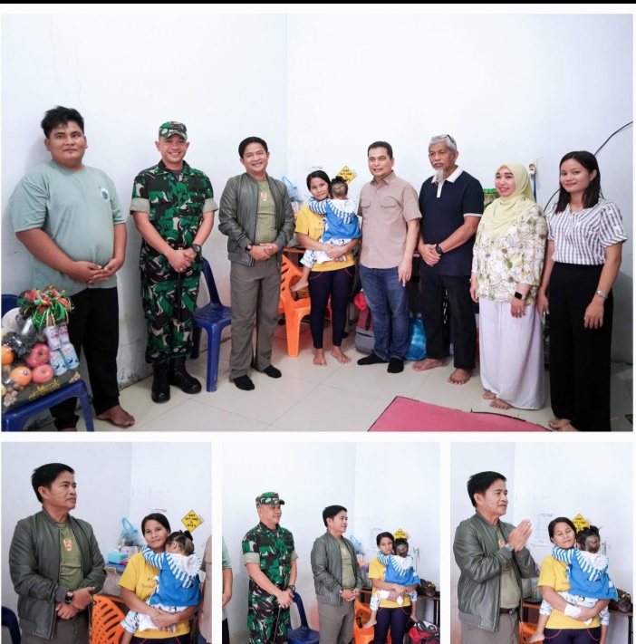 Pj Gubernur Sumut Hassanudin saat menjenguk balita Mesrida Waruru (3,6), anak nelayan asal Nias Utara, usai menjalani operasi benjolan di kepala, di Jalan Karya Indah, Tanjung Sari, Medan, Senin (25/12/2023). Foto : Diskominfo Sumut. |