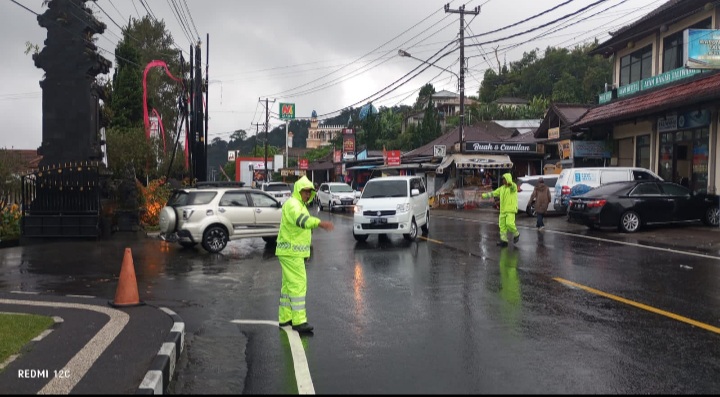 Tabanan - Walaupun cuaca hujan lebat, tidak menyurutkan semangat Personil Polsek Baturiti bersama Personil Pos Pengamanan DTW Ulun Danu Beratan melaksanakan penjagaan dan pengaturan arus lalu lintas di Depan Obyek Wisata DTW Ulun Danu Beratan Desa Candikuning Kecamatan Baturiti Kabupaten Tabanan.