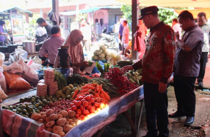 Pasaman - Menyikapi moment peringatan hari besar keagamaan dan pergantian tahun di penghujung tahun 2023 ini, Bupati Pasaman Sabar AS lakukan peninjauan harga kebutuhan bahan pokok di Pasar Kumpulan, Kecamatan Bonjol, Kamis (28/12/1023).