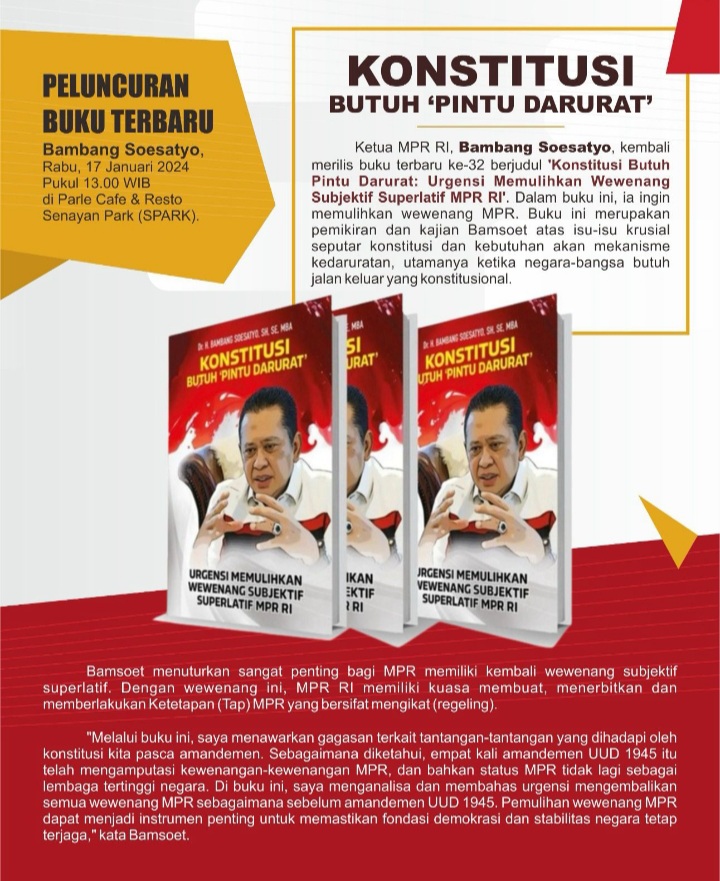 Jakarta - Ketua MPR RI, Bambang Soesatyo, kembali merilis buku terbaru ke-32 berjudul 'Konstitusi Butuh Pintu Darurat: Urgensi Memulihkan Wewenang Subjektif Superlatif MPR RI'.
