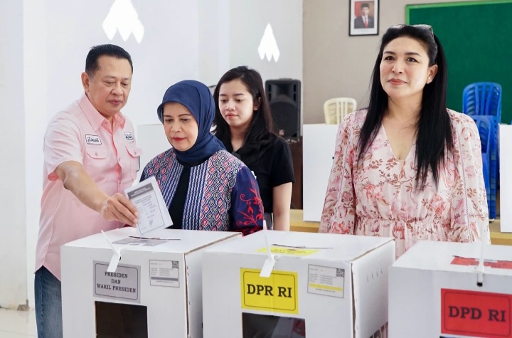 Purbalinga - Ketua MPR RI sekaligus Wakil Ketua Umum Partai Golkar serta Legislator DPR RI Dapil 7 Jawa Tengah meliputi Kabupaten Purbalingga, Banjarnegara, dan Kebumen Bambang Soesatyo bersama keluarga menggunakan hak pilihnya di TPS 12 Purbalingga. Dirinya mengajak para elite politik, pendukung, dan masyarakat untuk tetap menjaga suasana kondusif yang telah berhasil diwujudkan sejak pendaftaran partai politik, pendaftaran Caleg serta Capres-Cawapres, kampanye, masa tenang, hingga kini pemilihan.