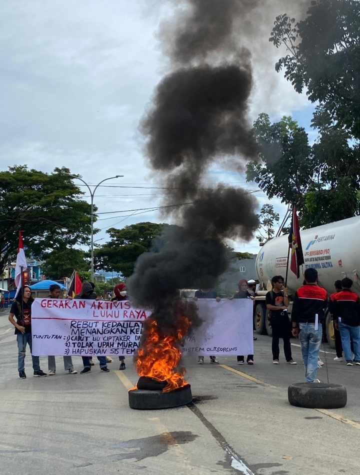 Palopo - Momentum peringatan Hari Buruh Internasional (May Day), Gerakan Aktivits Mahasiswa Luwu Raya (GAM-LR) menggelar aksi unjuk rasa di pertigaan Trans Sulawesi Jl. Perum Imbara I, Kel. Takakalala Palopo, Rabu 1 Mei 2023.