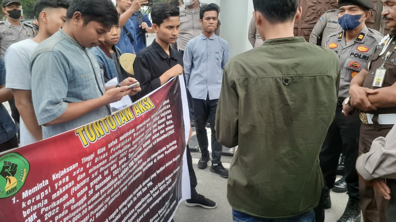 Barisan Massa AMBR didepan Pintu Gedung Kejaksaan Tinggi Provinsi Riau, Selasa (2/8/2022) |