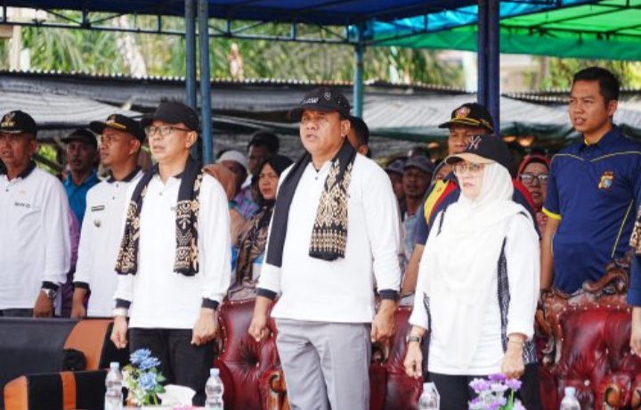 Kuansing - Bupati Kuantan Singingi (Kuansing) Suhardiman Amby disambut ribuan warga Desa Beringin Jaya Kecamatan Singingi Hilir, saat membuka pencanangan bulan bakti gotong royong (Goro), Selasa (03/9/2024).