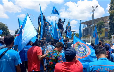 Pekanbaru - Sekitar lima ribu massa yang tergabung dari persatuan organisasi buruh Federasi Serikat Pekerja Transportasi Indonesia (F-SPTI) dan Konfederasi Serikat Pekerja Seluruh Indonesia (K-SPSI) se Provinsi Riau gelar aksi unjuk rasa di depan kantor Gubernur Provinsi Riau, Jalan Jendral Sudirman, Kecamatan Sukajadi, Kota Pekanbaru, (15/09/2022).