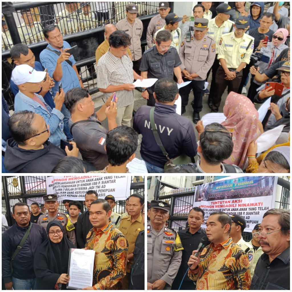 Medan - Forum Orang Tua Calon Siswa TNI AD Korban Penipuan Oknum Nina Wati Masuk TNI AD di Rindam 1/BB Pematang Siantar melakukan aksi demo menuntut agar pelaku penipuan dan penggelapan 'Nina Wati' senilai puluhan Miliar itu agar ditangkap dan di hukum sesuai perundang-undangan yang berlaku di Indonesia, pada Selasa. (11/02/25) Terpantau sejak pagi sekira pukul 09.00 WIB, puluhan pengunjuk rasa yang tergabung dari orang tua korban penipuan masuk TNI AD sudah mendatangi Kantor DPRD Provinsi