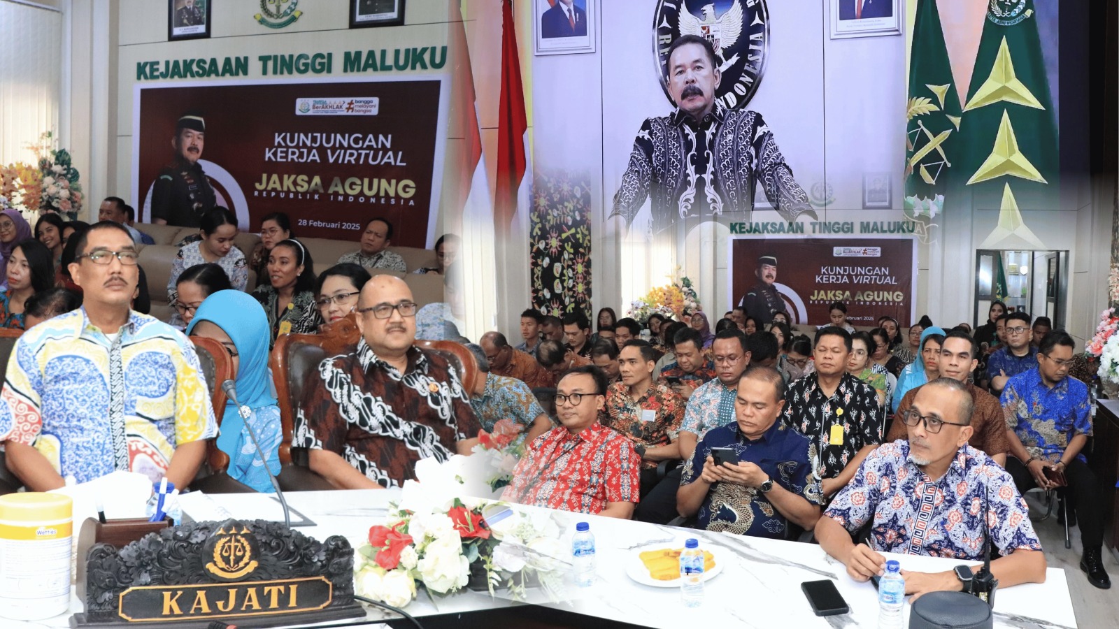Ambon - Kepala Kejaksaan Tinggi Maluku Agoes Soenanto Prasetyo, S.H.,M.H beserta jajaran Kejaksaan Tinggi Maluku, secara Virtual menghadiri Kunjungan Kerja Jaksa Agung Republik Indonesia ST. Burhanudin, melalui Zoom Meeting diruang Vicon Kejaksaan Tinggi Maluku, pada hari ini Jumat (28/02/2025).Turut hadir mendampingi Kepala Kejaksaan Tinggi Maluku, yakni Wakil Kepala Kejaksaan Tinggi Maluku Dr. Jefferdian, Para Asisten, Kabar Tata Usaha, Para Koordinator, Para Kasi dan Kasubag serta Para
