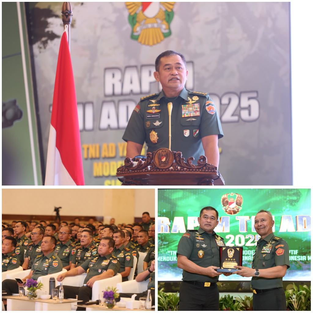 Jakarta - Kepala Staf Angkatan Darat (Kasad) Jenderal TNI Maruli Simanjuntak, M.Sc., menegaskan bahwa TNI AD akan terus menata organisasi dan memperkuat gelar kekuatan yang adaptif serta responsif terhadap berbagai ancaman, demi menjaga stabilitas nasional sekaligus meningkatkan kesejahteraan masyarakat.Hal tersebut disampaikan Kasad dalam Rapat Pimpinan (Rapim) TNI AD Tahun 2025 yang berlangsung di Raffles Grand Ballroom, Balai Kartini, Jakarta, Senin (3/2/2025). Rapim ini diikuti oleh para