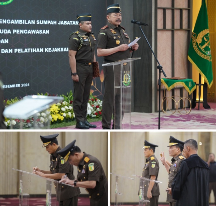Jakarta - Jaksa Agung ST Burhanuddin memimpin prosesi pelantikan dan pengambilan sumpah jabatan dua pejabat eselon I di lingkungan Kejaksaan Republik Indonesia yakni Dr. Rudi Margono, S.H., M. Hum., sebagai Jaksa Agung Muda Pengawasan dan Dr. Leonard Eben Ezer Simanjuntak, S.H., M.H. sebagai Kepala Badan Pendidikan dan Pelatihan Kejaksaan RI, yang dilaksanakan di Aula Lantai 11, Gedung Utama Kejaksaan Agung pada Rabu (18/12/2024).Dalam amanatnya, Jaksa Agung menyampaikan bahwa pelantikan