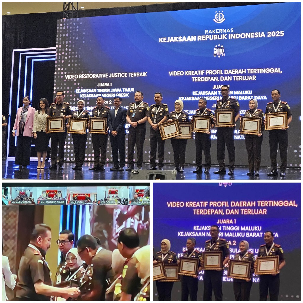 Jakarta - Kepala Kejaksaan Tinggi Maluku Agoes Soenanto Prasetyo, S.H.,M.H dalam kegiatan Rapat Kerja Nasional Kejaksaan Republik Indonesia di The Sultan Hotel & Residence Jl. Gatot Subroto Kota Jakarta Pusat, pada hari ini Kamis 16 Januari 2025, menerima Piagam Penghargaan untuk Juara 1 lomba pembuatan Video Kreatif dalam kategori Profil Daerah Tertinggal, Terdepan dan Terluar (3T).Penyerahan Piagam Penghargaan dimaksud, diserahkan langsung oleh Jaksa Agung Republik Indonesia ST.