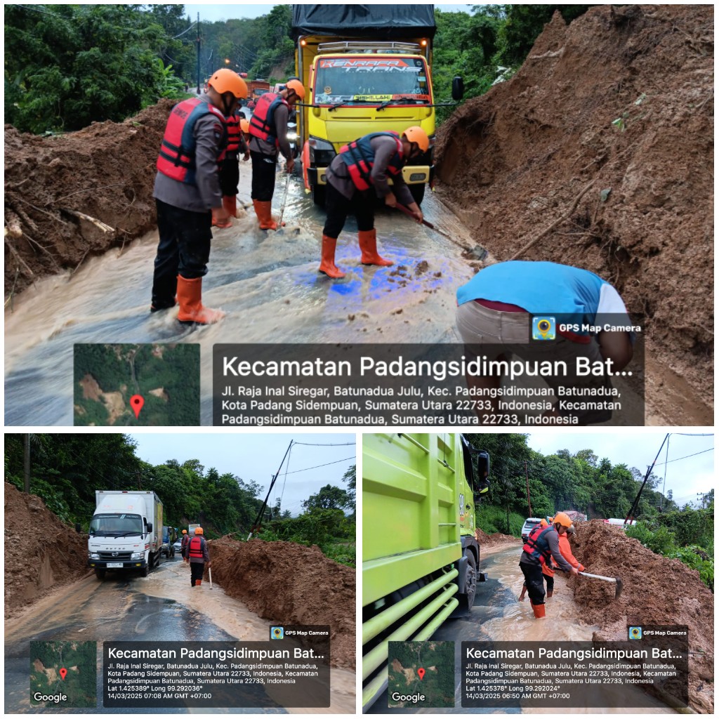 Padang Sidempuan - Sedikitnya 30 personel Batalyon C Pelopor Satuan Brimob Polda Sumut turun membersihkan material longsor akibat cuaca ekstrem yang melanda Kota Padang Sidempuan. Operasi evakuasi dan pembersihan yang dipimpin Danki 1 Batalyon C, AKP, Marihot Sitorus bergerak cepat untuk menggeser tumpukan tanah longsor dan ranting pohon yang menutupi mulut jalan, sehingga akses vital di Jalan Raja Inal Siregar, Batunadua Jae, Kecamatan Padang Sidempuan Batunadua, Sumatera Utara dapat segera