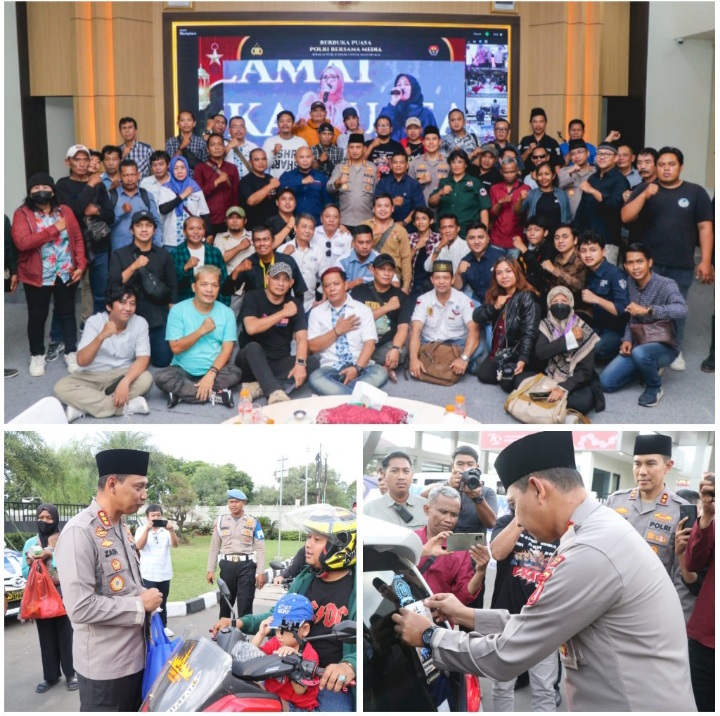Tangerang - Kepolisian Resor Metro Tangerang Kota, Polda Metro Jaya bersama puluhan wartawan berbagi Takjil kepada masyarakat pengguna jalan di depan Gedung Mapolres, Jalan Perintis Kemerdekaan, Babakan, kota Tangerang, Banten, Kamis (13/3/2025) petang WIB.Kegiatan tersebut di inisiasi langsung oleh Mabes Polri di Jakarta, kegiatan tersebut dipimpin langsung oleh Wakapolri serta diikuti oleh jajaran Polda dan Polres di seluruh Indonesia melalui zoom meeting.Usai membagikan Takjil kepada
