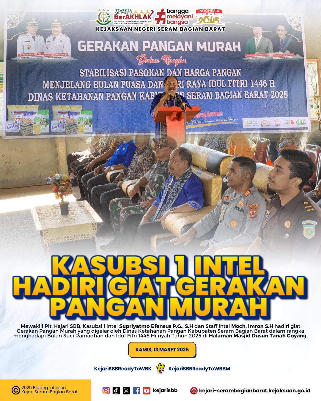 Seram Bagian Barat - Plt Kajari SBB Bambang Heripurwanto S.H., M.H diwakili oleh Kasubsi 1 Intel Supriyatmo Efensus P.G, S.H dan Staff Intel Moch. Imron menghadiri giat Gerakan Pangan Murah oleh Dinas Ketahanan Pangan Kabupaten Seram Bagian Barat di Dusun Tanah Goyang, Kecamatan Huamual yang laksanakan pada hari Kamis, 13 Maret 2025.Kegiatan ini dalam rangka memberikan stabilisasi pasokan dan harga pangan dalam masa bulan puasa Ramadhan dan Idul Fitri 1446 Hijriyah Tahun 2025 di Kabupaten Seram