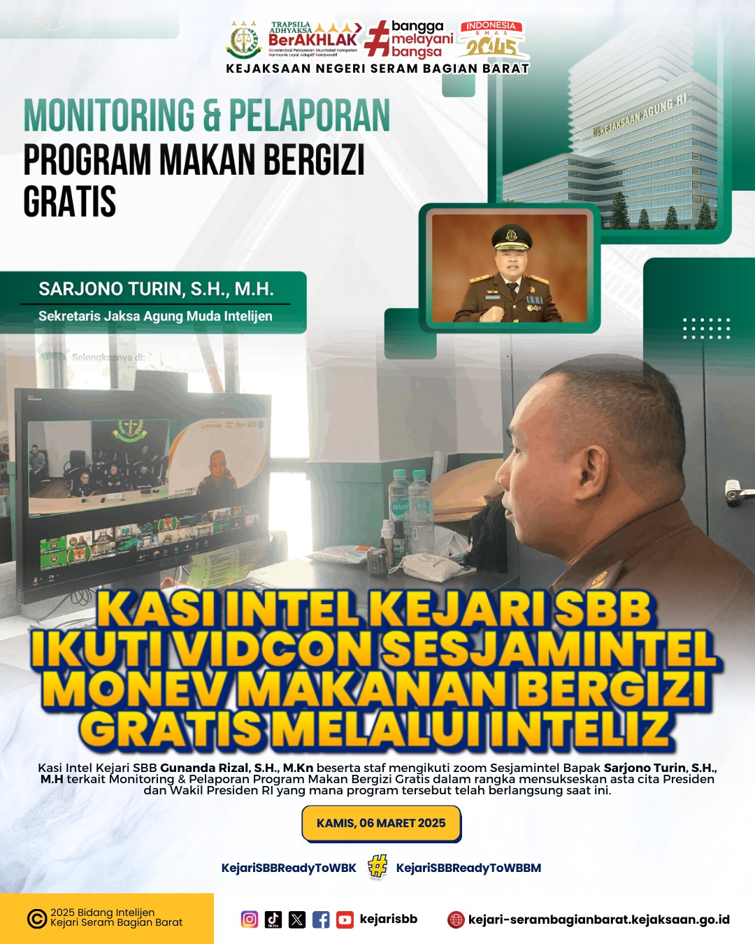 Seram Bagian Barat - Kasi Intel Kejari Seram Bagian Barat (SBB) Gunanda Rizal, S.H., M.Kn beserta staf mengikuti zoom Sesjamintel Sarjono Turin, S.H., M.H terkait Monitoring & Pelaporan Program Makan Bergizi Gratis (MBG) dalam rangka mensukseskan asta cita Presiden dan Wakil Presiden RI, pada hari Kamis (6/3/2025). Dalam paparannya, Sesjamintel Kejaksaan RI melaksanakan monev untuk memastikan distribusi makan bergizi gratis memenuhi gizi dan tepat sasaran diberikan kepada