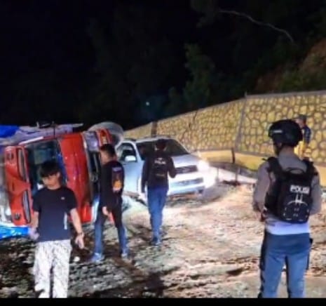 Kolaka, - Patroli Presisi Polres Kolaka pukul 20.00 Wita mendapatkan informasi dari masyarakat, terkait adanya Mobil Truk dengan plat DT 8113 BB yang bermuatan hasil bumi yang terguling di depan Depot Pertamina Jl. Poros Kolaka- Kolaka Utara di Kelurahan Kolakasi Kecamatan Latambaga Kabupaten Kolaka (7/4/2025).Tim patroli Presisi tersebut lansung menuju TKP dan memberikan pertolongan dengan mengatur lalu lintas agar tidak terjadi kemacetan dikarenakan Jalan tersebut Jalur Poros Kolaka-