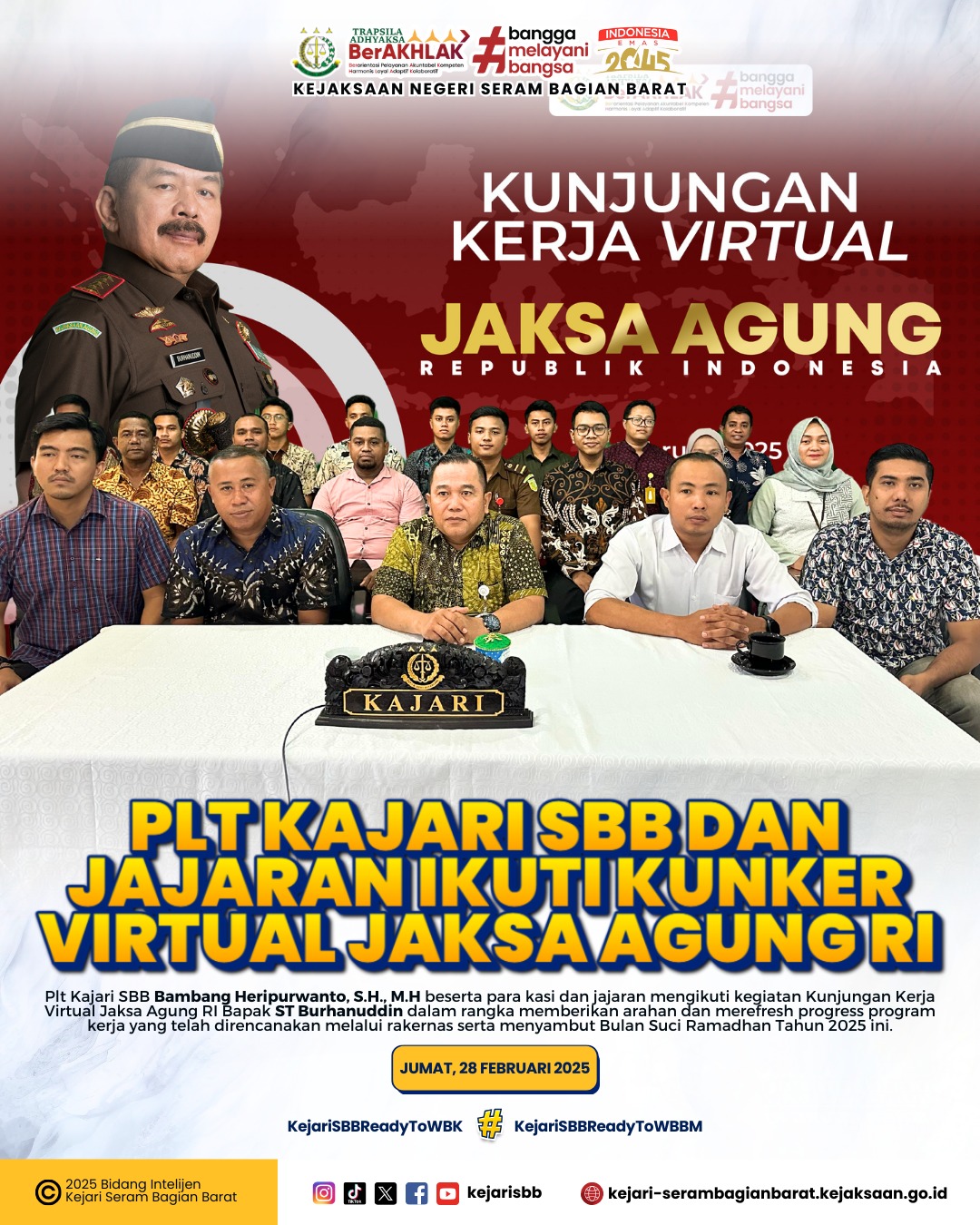 Seram Bagian Barat - Plt Kajari SBB Bambang Heripurwanto, S.H., M.H beserta para kasi dan jajaran mengikuti kegiatan Kunjungan Kerja Virtual Jaksa Agung RI Bapak ST Burhanuddin melalui Zoom Video Conference, pada Kamis, 28 Februari 2025.Kegiatan Kunjungan Kerja Virtual Jaksa Agung RI ST Burhanuddin dalam rangka memberikan arahan dan merefresh progress program kerja yang telah direncanakan melalui rakernas serta menyambut Bulan Suci Ramadhan Tahun 2025 ini.Dalam sambutannya, Jaksa