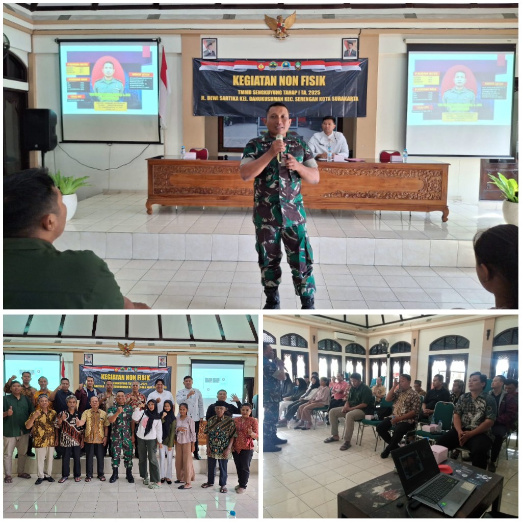 Surakarta - Komandan Koramil 03/Serengan Kodim 0735 Surakarta Kapten Cba Tri Rusman Prasetyo S.Sos selaku Tim penyuluh dalam Satuan Tugas (Satgas) TNI Manunggal Membangun Desa (TMMD) Sengkuyung Tahap I Tahun 2025 memberikan penyuluhan tentang nilai nilai ideologi pancasila kepada warga di Pendopo Kelurahan Danukusuman Serengan Kota Surakarta, Kamis (27/02/2025).Kegiatan penyuluhan tersebut merupakan salah satu sasaran kegiatan nonfisik selain dari sasaran fisik berupa pembangun
