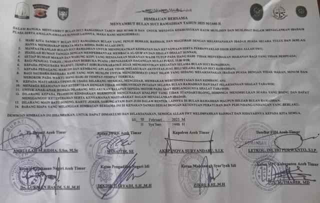 Aceh Timur - Musyawarah Pimpinan Daerah (Muspida) Kabupaten Aceh Timur Tetapkan Himbauan bersama menyambut bulan suci Ramadhan tahun 2025 M / 1446 H.Himbauan bersama tersebut ditandatangani oleh Pj Bupati Aceh Timur Amrullah M.Ridha, S.Sos, M.Sc, Ketua DPRK Aceh Timur Musaitir, SE, Kapolres Aceh Timur AKBP Nova Suryandaru, S.I.K, Dandim 0104 Aceh Timur Letkol Inf. Tri Purwanto, S.I.P, Kepala Kejaksaan Negeri Aceh Timur Dr. Lukman Hakim, SH, MH, Ketua Pengadilan negeri Idi Dikdik Haryadi, SH,
