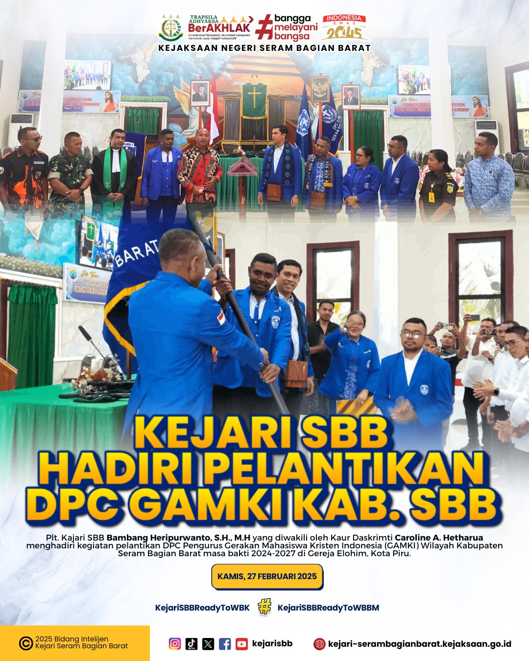 Seram Bagian Barat - Plt Kejari Seram Bagian Barat (SBB) Bambang Heripurwanto, S.H., M.H yang diwakili oleh Kaur Daskrimti Caroline A. Hetharua menghadiri kegiatan pelantikan DPC Pengurus Gerakan Mahasiswa Kristen Indonesia (GAMKI) Wilayah Kabupaten Seram Bagian Barat masa bakti 2024-2027 di Gereja Elohim, Kota Piru.Kegiatan ini dihadiri oleh Bupati Kabupaten SBB yang diwakili oleh Sekretaris Daerah Kabupaten Seram Bagian Barat Leverne A. Tuasuun beserta Jajaran Forkopimda, Ketua Umum