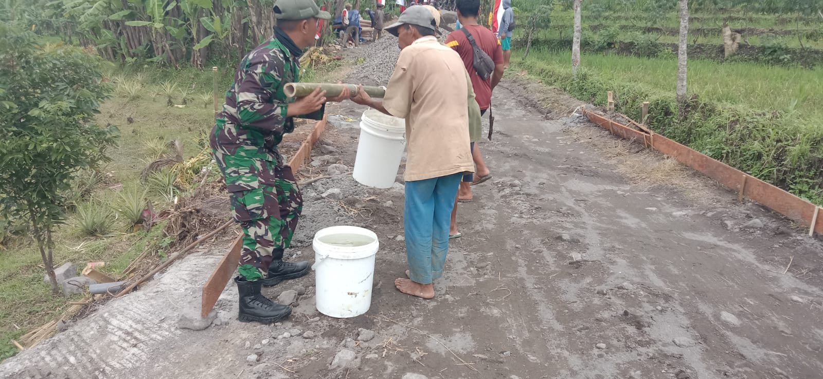 Boyolali - Personil Satgas TMMD Reg ke 123 Kodim 0724/Boyolali bersama masyarakat sedang mengisi air dengan cara manual/dipikul untuk pengecoran jalan rabat beton yang berada di Desa Kalinanas Kecamatan Wonosamudro Kabupaten Boyolali, pada Jumat (21/02/2025).Dalam mengatasi hal itu, personil Satgas TMMD Reg ke 123 Kodim 0724/Boyolali sedang mengisi air guna keperluan adukan semen pada mesin molen.Hal ini tidak menyulitkan kami dalam bekerja, walaupun terasa berat dengan dipikul hal tersebut tak