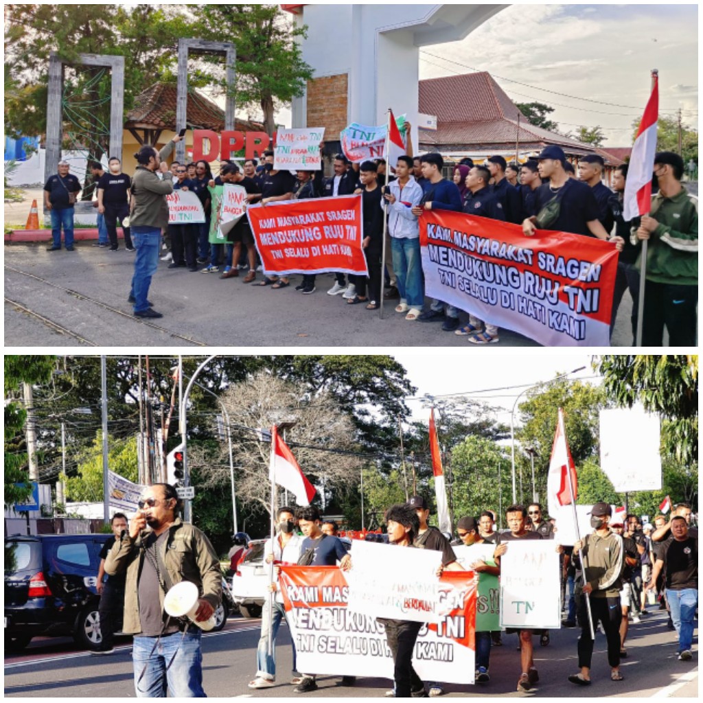 Sragen, - Tak kurang dari 100 orang pemuda yang yang menamakan diri Aliansi Masyarakat Sragen melakukan aksi simpatik dengan membentangkan spanduk dan poster bertuliskan dukungan RUU TNI. Mereka membentangkan spanduk dan poster berjalan dari lampu merah beloran menuju gedung DPRD Sragen. Sabtu (29/03/2025).Sesampainya di gedung DPRD mereka menyatakan sikap mendukung RUU TNI. Hendri selaku Koordinator aksi menyampaikan beberapa pernyataan Sikap/Orasi Masyarakat Sragen diantaranya : Kami