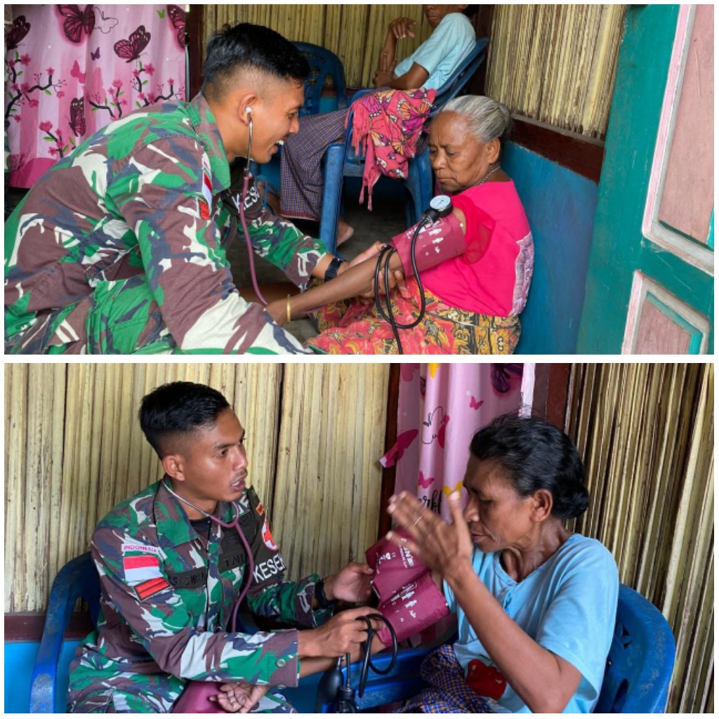 Timor Tengah Utara, - Satgas Pamtas RI-RDTL Sektor Barat Yonarhanud 15/DBY terus menunjukkan komitmennya dalam mendukung kesehatan masyarakat di wilayah perbatasan. Personel Pos Baen melaksanakan kegiatan pelayanan kesehatan keliling sekaligus pembagian vitamin gratis kepada warga di Desa Sunkaen, Kecamatan Bikomi Nululat, Kabupaten Timor Tengah Utara (TTU).Kegiatan ini dipimpin oleh Pratu Arrayan bersama tiga orang anggota Pos Baen yang secara langsung mendatangi rumah-rumah warga untuk