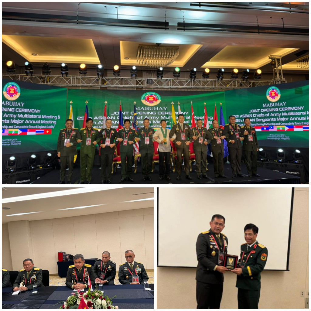 Filipina - Kepala Staf Angkatan Darat (Kasad) Jenderal TNI Maruli Simanjuntak, M.Sc., menghadiri pembukaan ASEAN Chiefs of Army Multilateral Meeting (ACAMM) ke-25 yang berlangsung di Grand Ballroom Hotel Hilton, Clark Pampanga, Filipina, Kamis (21/11/2024). Forum ini menjadi ajang penting untuk mempererat kerja sama militer di kawasan Asia Tenggara, memperkuat persahabatan, dan merespons tantangan keamanan regional.Acara pembukaan diawali dengan upacara militer dan sambutan dari Kasad Filipina,