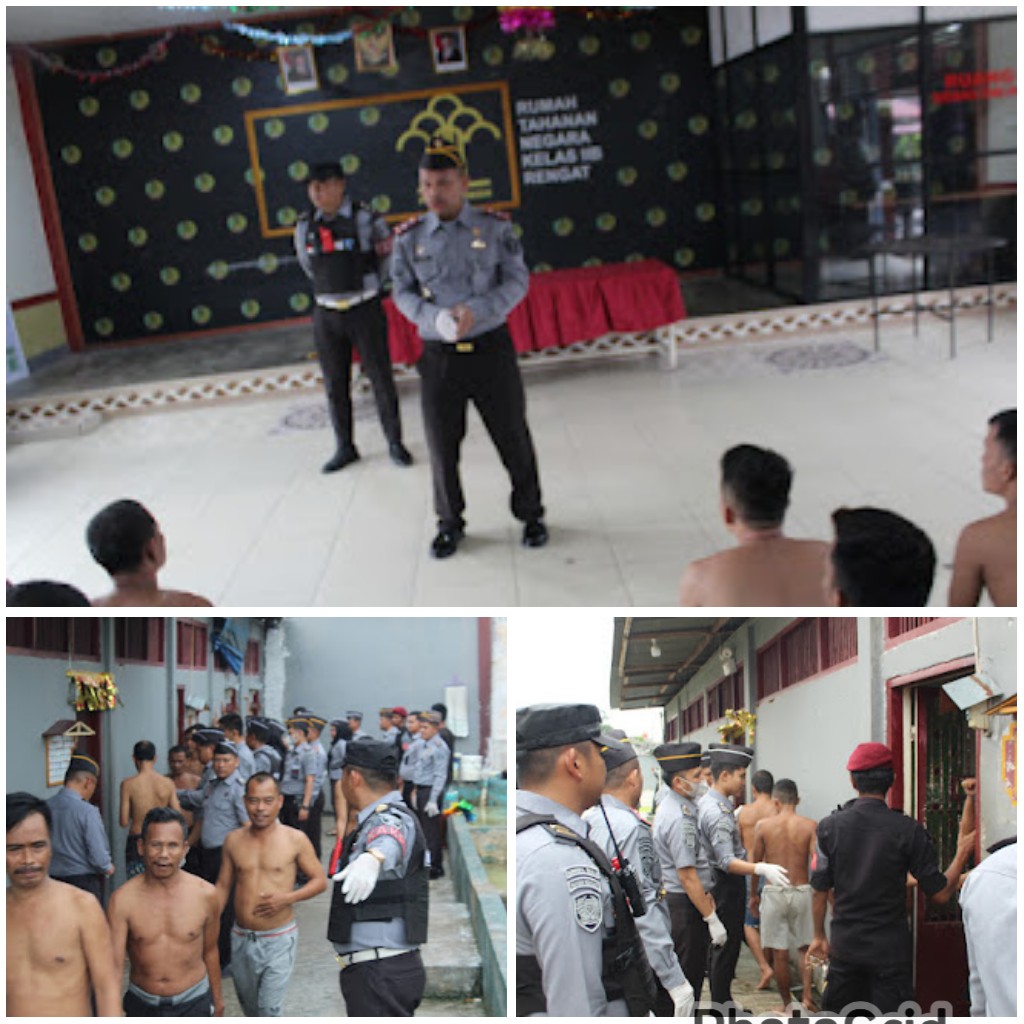 Inhu - Menyambut perayaan Natal dan tahun baru (Nataru), Rumah Tahanan Negara (Rutan) Kelas IIB Rengat, Kabupaten Indragiri Hulu (Inhu), Riau menggelar razia blok hunian warga binaan pada Selasa (24/12). Razia ini dilaksanakan dalam upaya mencegah gangguan keamanan dan ketertiban (kamtib) serta menjaga kondisi rutan tetap berlangsung aman dan kondusif. Razia kamar hunian warga binaan ini merupakan tindak lanjut dari surat edaran Plt. Direktur Jenderal Pemasyarakatan mengenai peningkatan