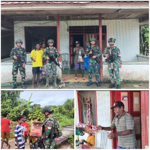 Satgas Pamtas Yonif 642/Kps Berbagi Sembako dan Makanan Ringan di Kampung Desra
