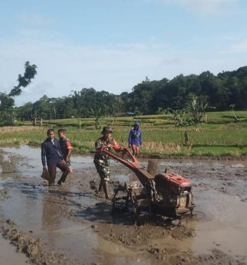 Wujudkan Ketahanan Pangan, Babinsa Serda Agus Joko Purnomo Koramil 15/Gemolong Turut Membajak Sawah