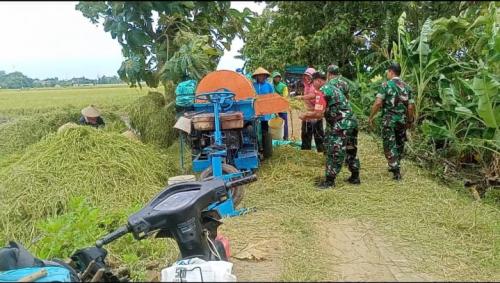 Babinsa Ds Plosokerep dan Dua Anggota Koramil 02/Karangmalang Bantu Petani Panen Padi