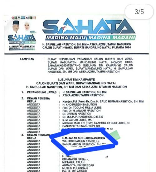 HM. Jafar Sukhairi Nasution Diminta Mundur Tim Kampanye "SAHATA" untuk Menjaga Netralitas Pilkada di Madina