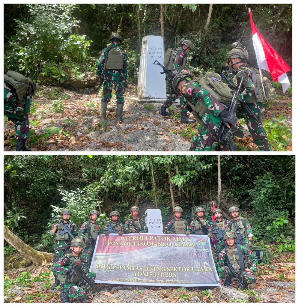 Skouw - Dalam rangka melaksanakan tugas pokok menjaga keutuhan wilayah NKRI, Personel Satgas Pamtas Yonif 131/BRS mempunyai tugas dan tanggungjawab untuk mengecek patok batas negara dalam posisi aman dan tepat pada posisinya mulai dari wilayah skouw di patok MM 1 membentang sepanjang garis perbatasan sampai dengan patok MM 4.1 di Distrik Waris, Kabupaten Keerom, Papua, Jum'at (11/10/2024).