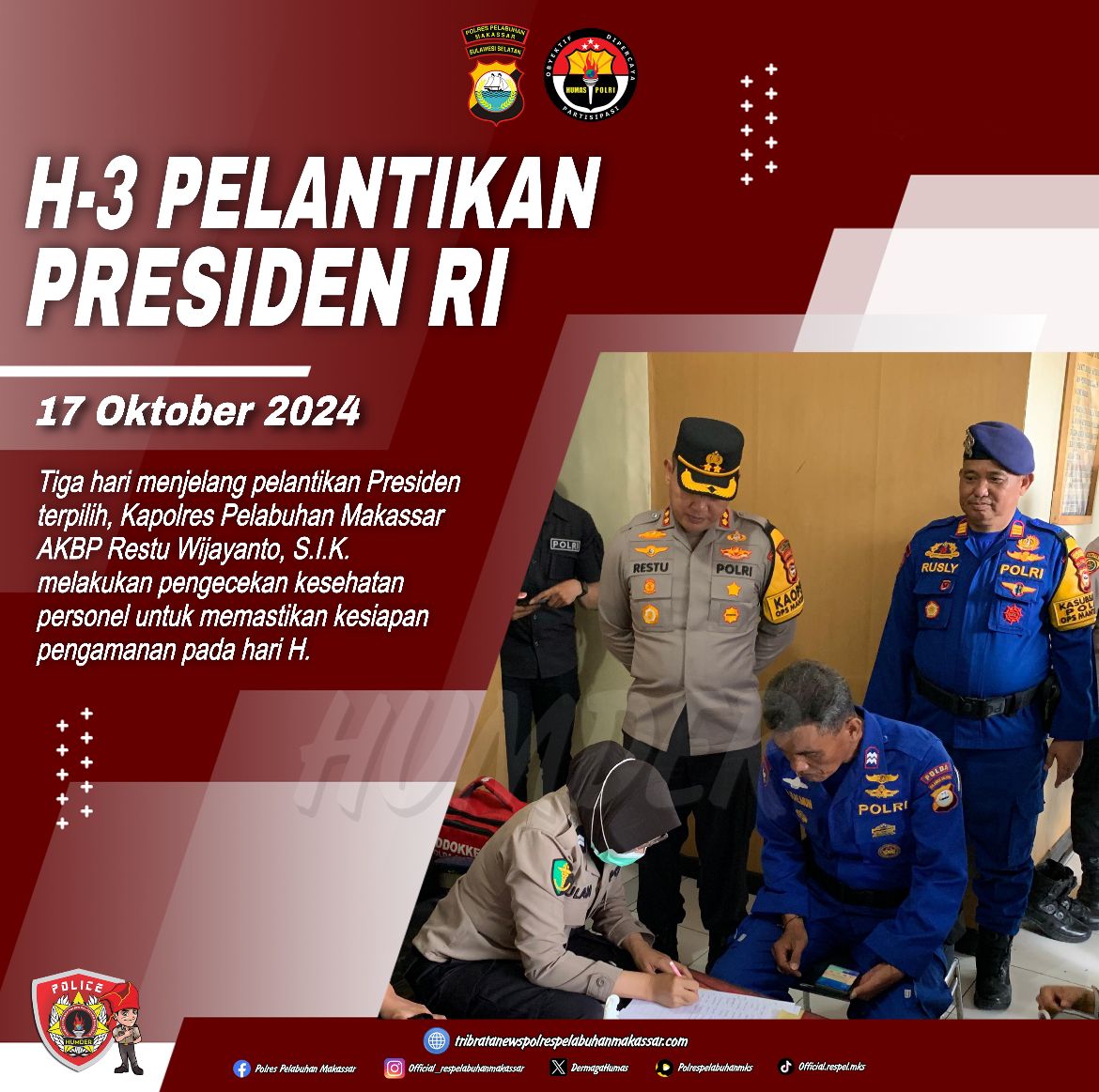 Humder - Tiga hari menjelang pelantikan Presiden terpilih, Kapolres Pelabuhan Makassar AKBP Restu Wijayanto melakukan pengecekan kesehatan personel untuk memastikan kesiapan pengamanan pada hari H. Langkah ini diambil untuk memastikan seluruh anggota Polres dalam kondisi prima dan siap menjalankan tugas pengamanan dengan maksimal.