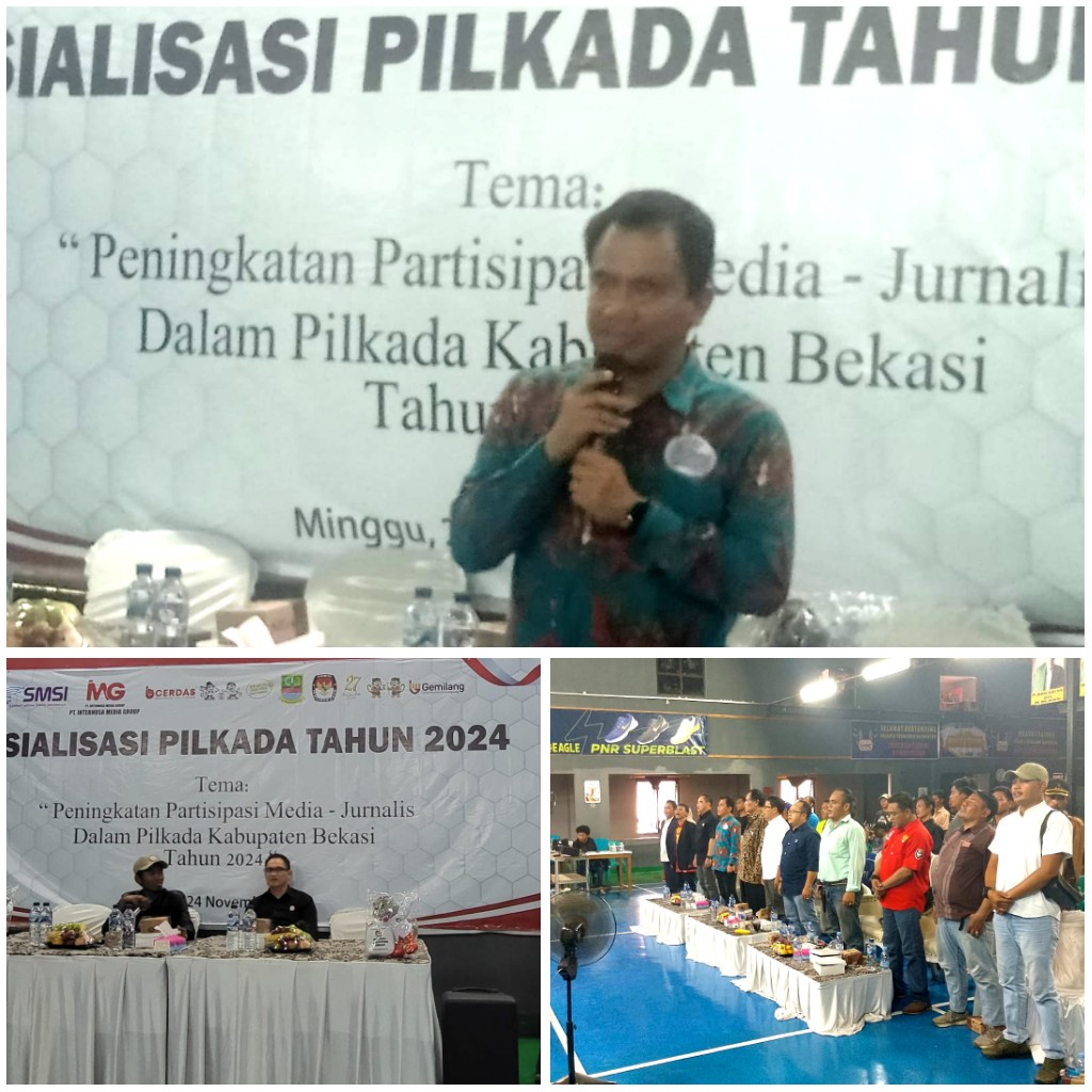 Bekasi - Serikat Media Siber Indonesia (SMSI) Kabupaten Bekasi, bekerja sama dengan Komisi Pemilihan Umum (KPU) Kabupaten Bekasi, menggelar kegiatan sosialisasi Pemilihan Bupati dan Wakil Bupati Bekasi tahun 2024. Kegiatan ini dilaksanakan di hari tenang, menjelang pencoblosan pada 27 November 2024, dengan tujuan meningkatkan partisipasi masyarakat dalam Pilkada Serentak 2024 di Kabupaten Bekasi.