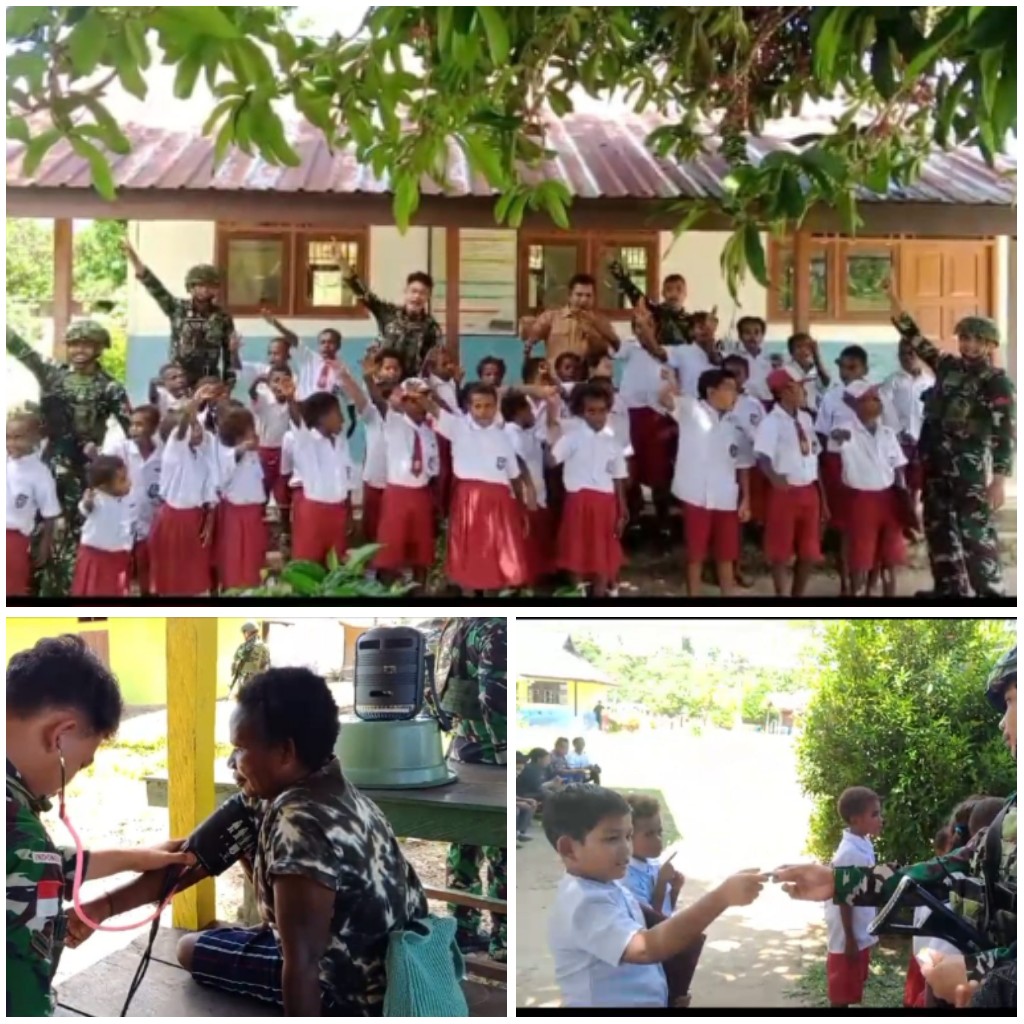 Teluk Bintuni - Satgas Pamtas Kewilayahan Yonif 642/Kps Pos jagiro personil pos melaksanakan pelayanan kesehatan keliling dan membagi vitamin kepada masyarakat dan anak-anak sekolah Distrik jagiro muskona selatan, Kabupaten Teluk Bintuni, Papua Barat pada Rabu (4/12/2024).