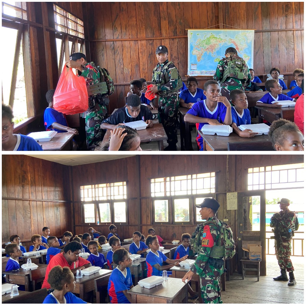 Teluk Bintuni - Upaya untuk meningkatkan gizi dan mewujudkan kesehatan generasi penerus, Pos Meyerga Satgas Yonif 642/Kps, melaksanakan program pemerintah yaitu pemberian makan pagi gratis yang dilaksanakan di SD Inpres Meyerga, Distrik Moskona Barat, Kabupaten Teluk Bintuni, Papua Barat. (6/12/2024).