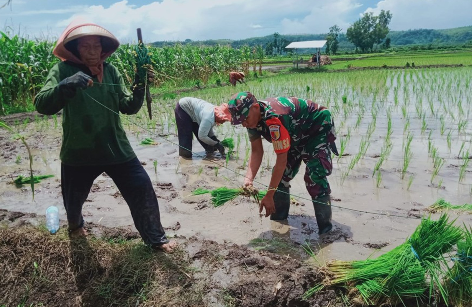 Blitar - Dalam rangka mendukung program ketahanan pangan nasional, Babinsa Desa Gununggede Posramil Wonotirto Koramil 0808/09 Sutojayan, Koptu Wahyu Anugerah, turun langsung ke sawah untuk membantu petani menanam padi.