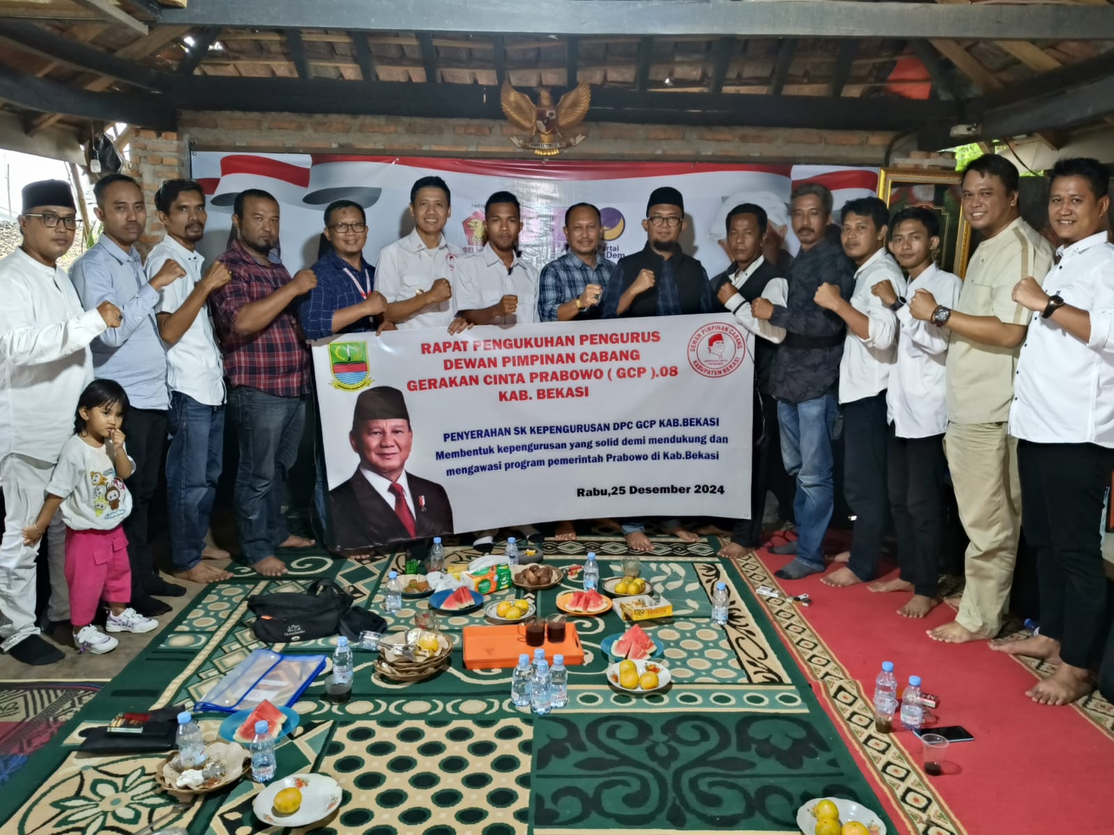Bekasi - Pada tanggal 25 Desember 2024 , bertempat di Empang Barokah, Iwan Centre, Cibitung , telah dilaksanakan penyerahan Surat Keputusan (SK) terkait kepengurusan Dewan Pimpinan Cabang (DPC) Gerakan Cinta Prabowo (GCP) 08 Kabupaten Bekasi . SK tersebut diserahkan langsung oleh Ketua DPD GCP 08 Jawa Barat, Iwan Iskandar, SE , kepada Ketua DPC Kabupaten Bekasi, Mulawarman .